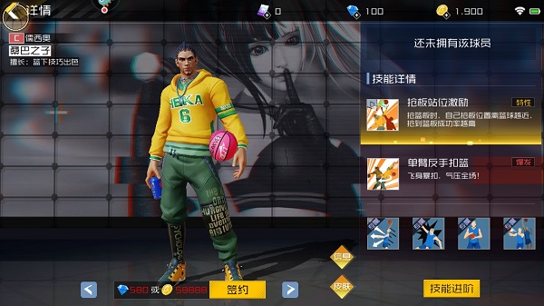 该角色可以通过首冲获得,其属性不难看出相当灵活,尤其是90点的篮板属性,所以在实战中尽量保证在篮下阻截对面中锋的投篮,再加上特性技能的效果,可以在盖帽失败的时候,也能继续起跳参与篮板球的争夺。