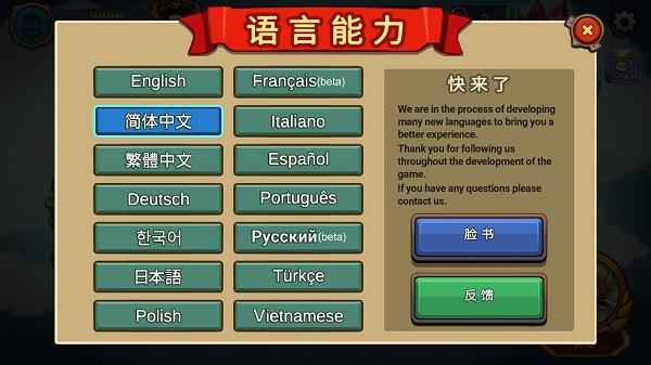 设置中文方法:进入游戏主菜单界面,点击右上方的“☼”图标-->弹出“SETTING”提示框,点击右边的“LANGUAGES”-->弹出“LANGUAGES”提示框,点击左侧“简体中文”-->弹出“将语言更改为简体中文”提示框,点击右边的“是”即可。