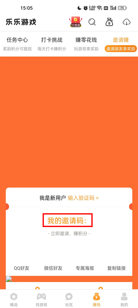 3、赚钱板块中拥有四个页面,分别是任务中心、打开挑战、赚零花钱、邀请赚,点击“邀请赚”就可以获得你的邀请码了。