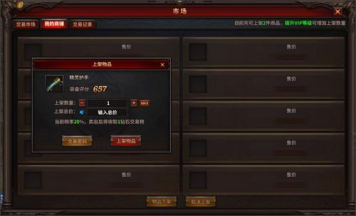 在市场系统[我的商铺]界面,可以通过点击“物品上架”,上架想要出售的流通物品。