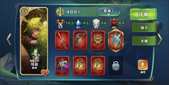8、天赋选择:大家在游戏画面中的左侧可以看到一个蓝色小三角,点进后选择英雄阿瓦隆。其中详情和天赋分别对应的是装备和技能,玩家在每一次的升级都会获得天赋点数,我们可以投资在不同技能上。随着技能等级的提高,所需的天赋点也会增加。以下就针对两种主要类型的玩家来作技能说明: