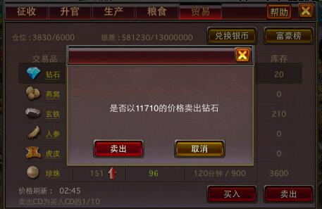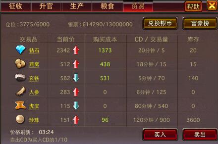 对于贸易就是低价格买入高价格卖出(谁都知道),千万不要买入后,价格一涨就卖出,这样只会浪费时间,浪费电。拿钻石来说,以1200的价格买入后,涨到了1290你就卖出了,不要这样。继续观望,它涨了点继续等,跌了也继续等(反正不能做亏本生意)直到涨到自己觉得高价格3000 - 4000在出手。可能等到高价格吗?要是降价了就不出手,系统10分钟刷一次早晚会涨的。怎么样算是低价格买入?还是拿钻石来说,它的价格区间在800 - 6000之间。 1000买入算低价格 2000一样算,涨到5000就是高价格。游戏不会吃饱了弄个价格区间在800 - 6500而不让钻石价格上5000的。我一直守着玩赚的会更快吗? 我经常听到有人在世界里面喊,贸易弄了一个小时就多了几千银票。 何苦一直守着出手入手呢,钻石1200升到了1290出手,换个玄铁520升了525在出手。 你可以等到价格升到成倍的时候出手,你来钱不是更快(不要说它要是不涨呢?它会涨的,何必浪费时间,浪费电的守在那里。)