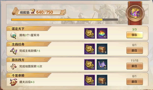 每做完一个成就任务会获得成就奖励及成就点数,成就值到一定数值可开启奖励,内含谋士:黄月英的碎片、银币、功勋奖励。是升星黄月英必不可少的获取方式!大家一定要多多做成就任务来给黄月英升星哦。