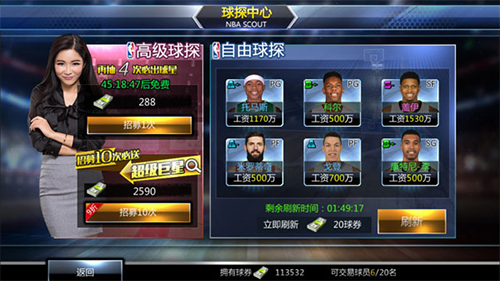自由球探每隔2小时免费刷新一次,还可以花费20球券立即刷新,自由球探里的球员可花费球券签约。