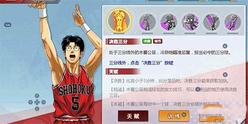 不同玩家的操作习惯不同,选择解锁天赋的顺序也会有很大不同。拿樱木花道来说,技能为:飞人(大招)、飞身篮板、庶民上篮、超级加速、哼哼防守和扑球。