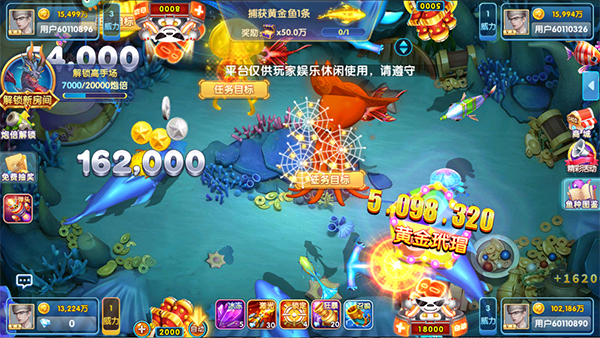 4、提供了各种道具,如加速、冰冻等,帮助玩家更好地捕鱼。