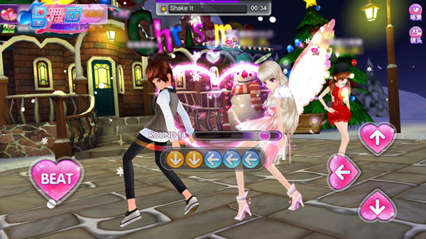 约会模式的操作和经典模式比较相似。都是输入相应的方向键 打击Beat键完成舞步,只不过约会模式在游戏过程中分二轮,其中每轮都会有跳舞、表白、配对、约会、四个阶段。