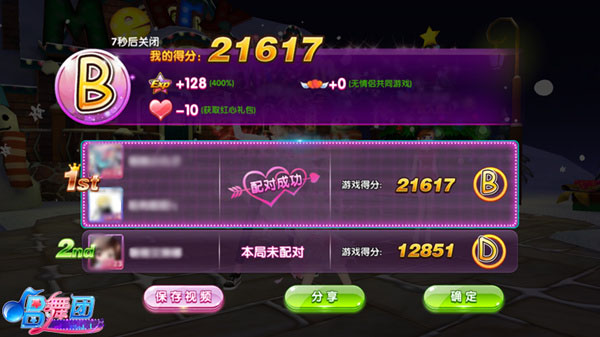 第四阶段:完成配对的2个人会完成一个亲昵的动作,并会2人靠拢站在一起进行游戏。身后还有一个大大的爱心哟!同时,游戏中方向键的notes变为爱心形状,成功击打的notes也有额外加成