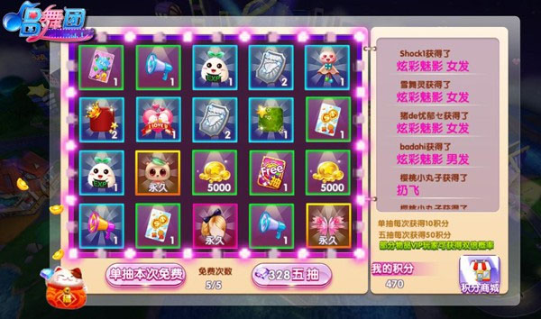 点击社区右上角的“幸运星”按钮。你会进入幸运星转盘抽奖系统,丰富的服饰道具奖励,转转转出来!每天将会得到5次免费的抽奖机会,或者使用钻石参与抽奖。