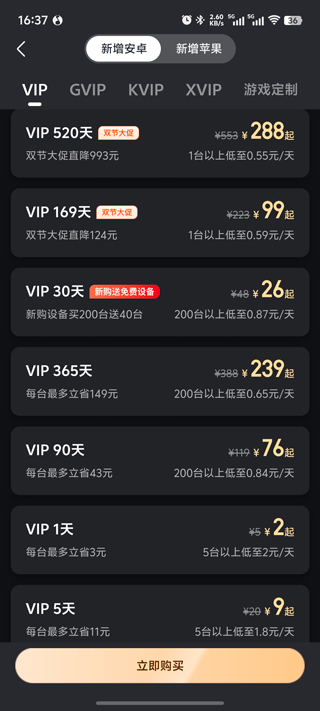 答:目前红手指有如下套供您选择:2元/天(限时开放),VIP套餐(9元/5天,38元/30天,98元/90天 ,168元/180天, 248元/365天),GVIP套餐(58元/30天,158元/90天,268元/180天,388元/365天),KVIP套餐(4元/1天,18元/5天,77元/30天 ,196元/90天, 496元/365天) 。IphoneGVIP套餐 (4元/1天,18元/5天,77元/30天 ,196元/90天, 496元/365天)