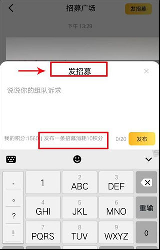 2、接着进行输入招募组队的要求是,需要消耗积分后,才可以发布。