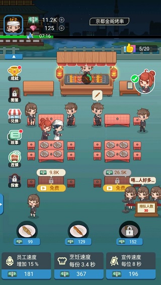 通过点击升级来获得更多色味俱佳的烤品,升级服务员和厨师的等级,满足食客们的口腹之欲。