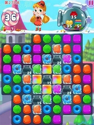 冰块障碍会冻住里面的糖果,使它无法移动和交换。玩家需要和冰块里面的糖果进行匹配消除来破坏掉冰块。