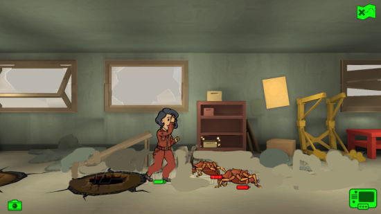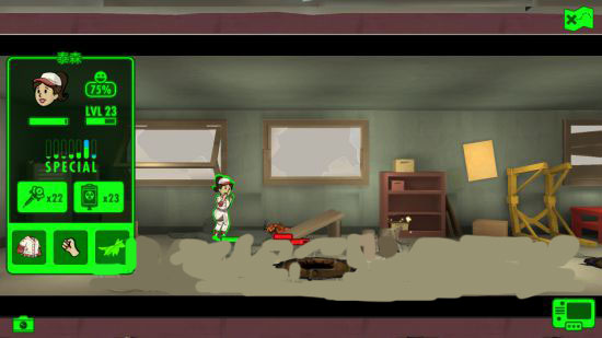 为了确保能顺利刷到副本,我把探索的所有小人都叫了回来,第一次我派出了一个一级小人配备一把+4半自动步枪和一只绿宠(牧羊犬 废土寻获的瓶盖+8%),运气很好第一个副本是废土胜地,一层四只蟑螂二层鼹鼠的那个副本。第一只蟑螂用肉搏打不带宠物,因为肉搏伤害1,测出血量为9,第二只带上宠物,正好三次击杀,证明肉搏情况下,带绿宠伤害+2,第三只用带上+4武器,一次攻击恰好掉了三分之二血量,也就是6点攻击力,说明宠物伤害能加成在武器上。第一次结束。