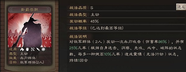 【卧薪尝胆】也许你们已经忘了,能让【卧薪】收益最大化的既不是赵云,也不是凌统,而是该战法的传承武将:孙权。集满BUFF(增益状态)后高达75%的震慑概率,基本能保证大部分时候都是双控。