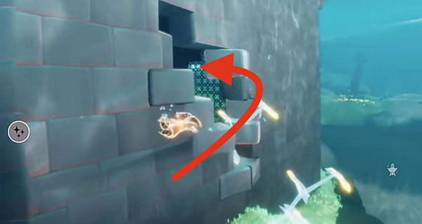 3、领取任务之后会触发一段动画,动画结束后朝着小船的后面飞,会看到一座小塔,在小塔的底部切换潜水模式进入水中。