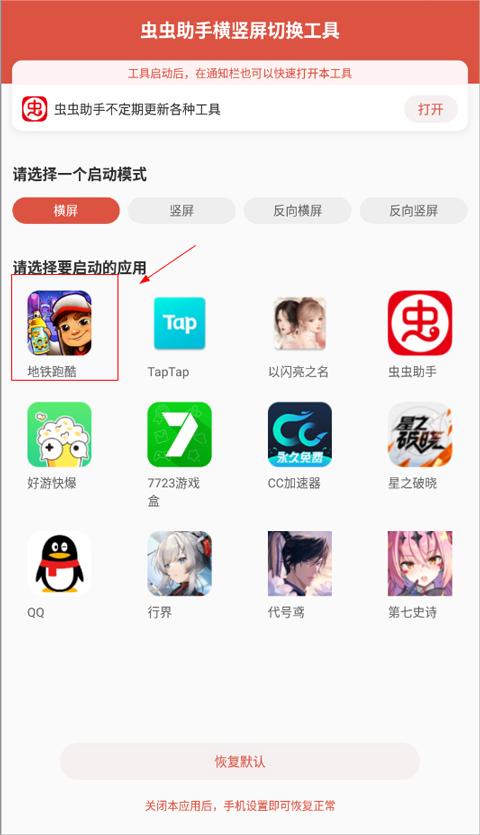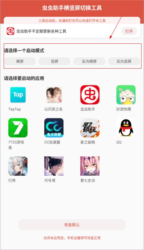 1、下载安装虫虫助手横屏切换工具,运行软件,选择启动模式,支持横屏、竖屏、反向横屏、反向竖屏;