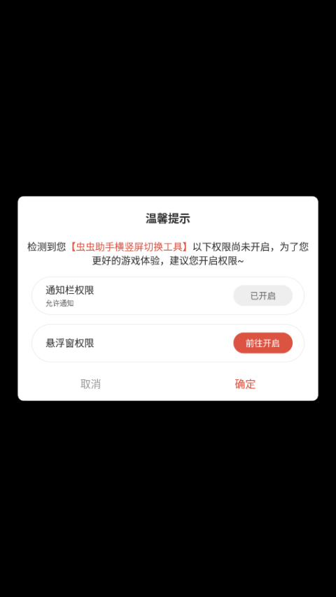 2、应用会提示开启通知和悬浮窗权限,点击前往开启;
