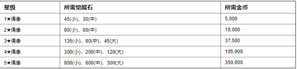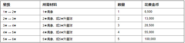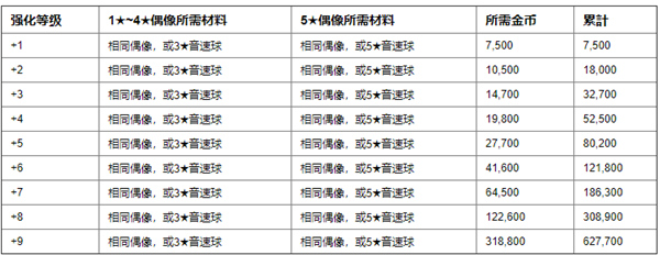 以下为偶像每强化一级所消耗的金币,数量还是非常多的,所以初期最好还是不要随便提升1~2星的偶像,除非后期收藏。