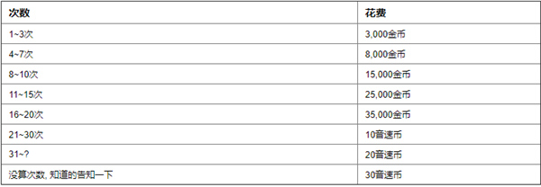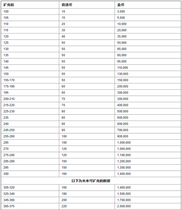 以下为每扩充一次偶像栏位时所需要花费的音速币以及金币