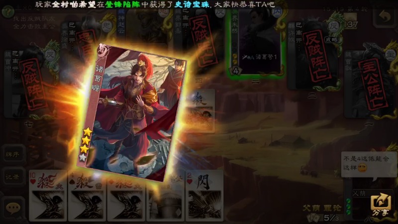 军八反贼人数最多,这也就变向加大了诸葛瞻给队友控好牌的几率,再加上对卖血流武将的克制(主流主公+忠)。输出一般的诸葛瞻在反这个位置上游刃有余。