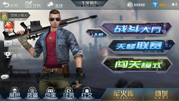 主界面最显眼的位置是玩家当前的游戏角色,占据画面的大部分,其次是位于角色右侧的战斗选择,包括战斗大厅、天梯联赛、闯关模式等选项。游戏系统被分布在 了画面的左侧与下方。左上角是签到与公告栏。左侧与左下角是玩家的个人信息,背包仓库与交互系统,在这里可以查看个人数据,整理装备,添加好友、收发邮件 等。右下角是军火库和商城的消费场所。总体来说,整个界面布局层次分明、井井有条,让玩家能够一目了然。