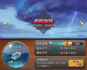 随机未知事件以及探索寻宝的次数增加了不少,并且海盗的数量减少容易通关,最重要的一点就是解锁新城市后遇到的前几批海盗的实力没有大幅增长,减少了玩家纠结是否继续解锁新城市的烦恼。在这次更新的新版本当中,以危险海域为主,随机事件以及探索寻宝的次数增加,对应的就探索危险海域获得的奖励更多更丰厚。航行进度的8/16/24点的奖励依旧丰厚没变,话不多说,出航的第一步先给船队提升口才和士气。