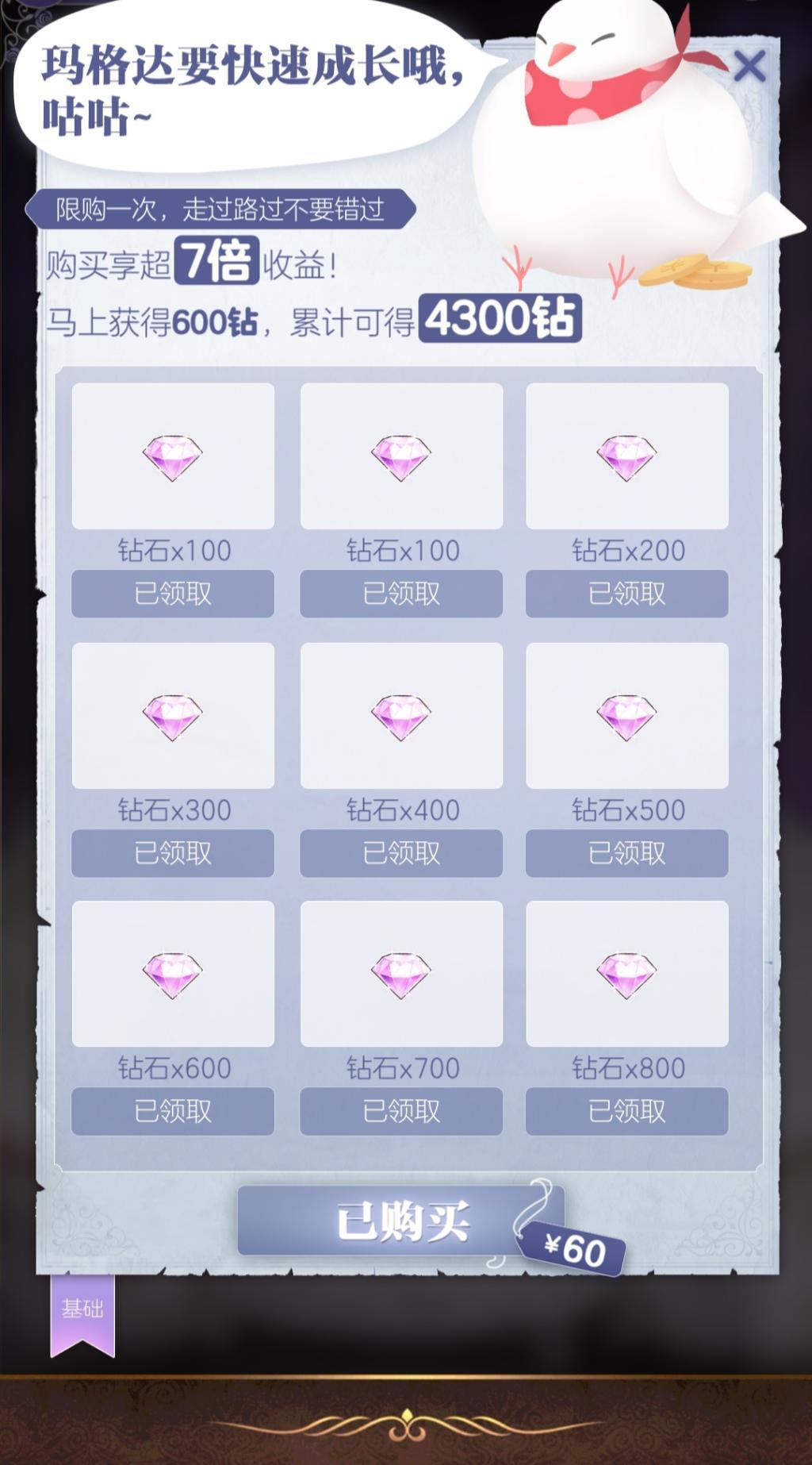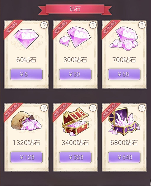 ①咕咕罐,这个是我十分推荐的,个人感觉是最划算的一种,只需要60块钱就可以获得4300钻石。比起同段位的68元买钻石加上双倍的1400钻石要多出2900钻石。【不过这个罐头只能一次】