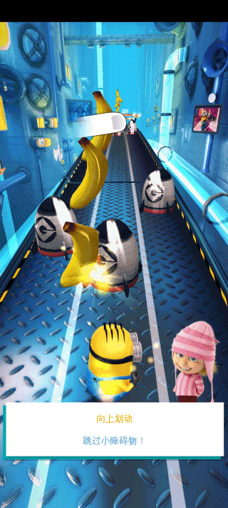 2、用手指向右滑动可以使小黄人避开障碍物。