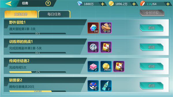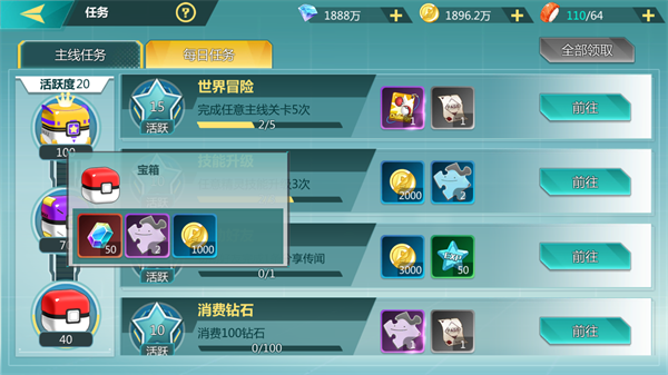 日常任务每日刷新,包含战斗、捕捉、培养等简单任务,完成后奖励经验值和活跃度。
