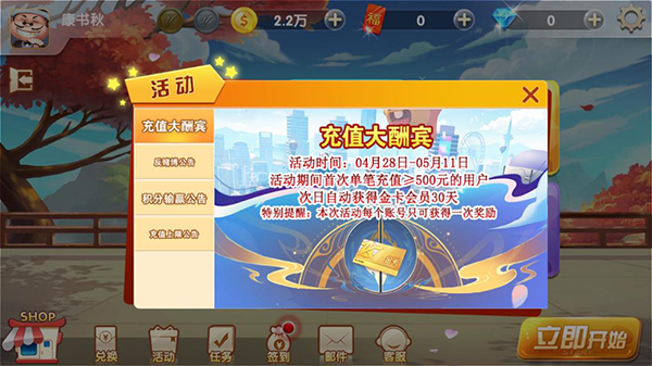 1、每天登陆送豪礼,连续登陆送更多,诚意满满,积分不足自动发放,让您免费打牌