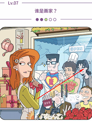 耳朵上别着画笔,留着胡子梳着辫子很有艺术气息的大叔就是画家。