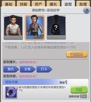 技能栏展示了当前艺人所拥有的技能,从而区分了“站街艺人”“宠儿艺人”“普通艺人”等不同类型。图中冒险天赋技能是当狼叔穿上造型卡后额外获得的一个隐藏技能加成,这个在后续的介绍中会具体说明。