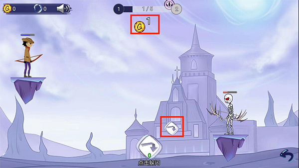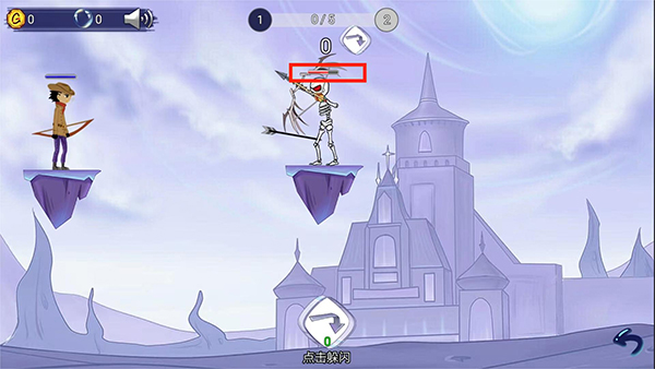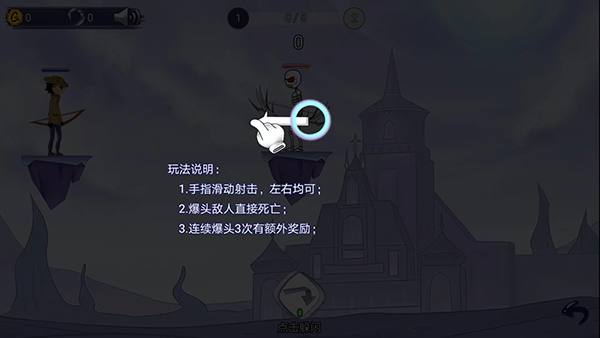 2、出现玩法说明,手指通过左右滑动屏幕来进行拉弓射击,通过上下滑动来瞄准敌人,松开屏幕就可以开始攻击了,如果爆头敌人将直接死亡,
