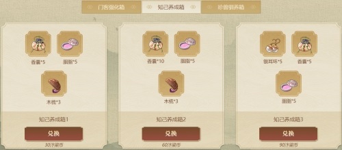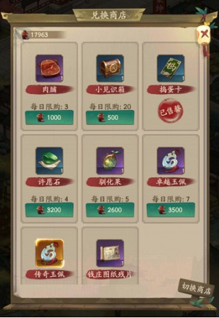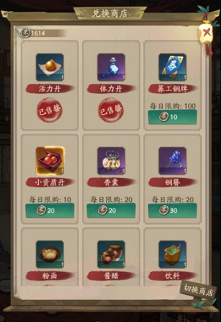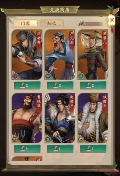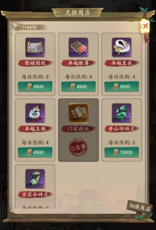 客栈商店兑换必先门客残帖,然后根据情况兑换其他资源。前四个每天至少兑换一次,第一次性价比最高,第二次如果稀缺材料的话还可以再兑换一次,第三次兑换就会很亏。没有交子就去宴会商店或者商会买食材烹饪。至于开山碎片什么的,交子多的话可以每天各兑换一个。慢慢攒,这是个长久的过程。