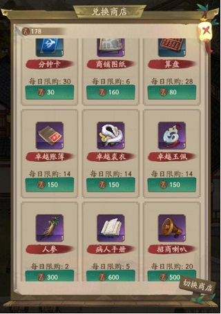 商战商店最为致命,价格涨幅很大。每天兑换也有技巧。人参兑换2-3个,中间三个各兑换一个(如果很缺,也可以兑换各两个,再多就巨亏了),图纸可以兑换2-5个。算盘兑换2-4个。这样商战币利用最大化。(以上通过数学算出来的)