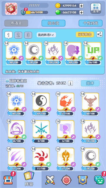 《欢乐对决》手游中的阵容位于第二栏,点开之后可以看到【布洛克】【组合技】【个性对战】三个版块,其中布洛克版块,玩家可以看到自己拥有/为拥有的布洛克以及自己的阵容/冠军阵容和暴击伤害数值。组合技版块,玩家可以看到游戏中特定布洛克组合后能触发的隐藏技能,比如【战斗光环、旋风冲锋】等等。个性对战版块中,玩家可以看到自己已经拥有/为拥有的战场皮肤和表情。