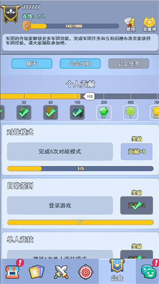 《欢乐对决》手游中的公会位于第五栏,玩家可以创建自己的公会,公会版块中从上到下依次是【公会ID/头像】【公会等级】【公会管理】【公会荣耀榜】【公会聊天/互助/任务】,其中完成公会任务可以获得金币、钻石和宝箱等奖励,公会互助功能可以让玩家之间交换得到自己想要的布洛克。