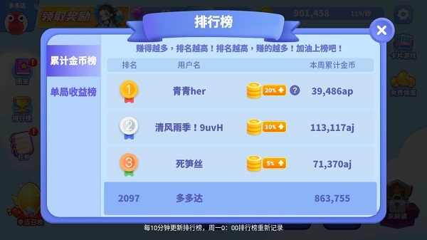 不过游戏内提供了排行榜功能,有累积金币榜,有单局收益榜。想要赚的更多,就要榜上有名,排名越高,赚的越多,加油上榜吧少年!