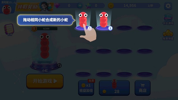 想拥有各种各样的小蛇?轻轻挪动手指,把相同的小蛇合成起来,解锁更多更强的蛇蛇。