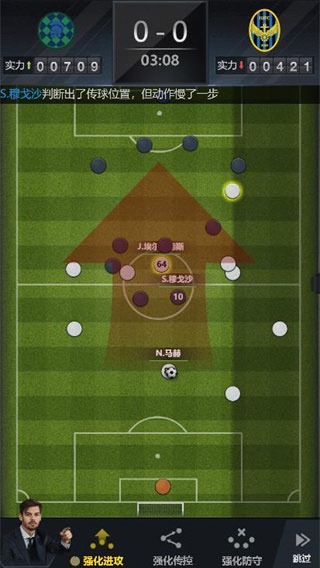 1、初入游戏世界,荣耀冠军h5游戏准备了比较贴心的新手引导,手把手教玩家体验游戏的每一个步骤。包括如何在比赛中强化进攻,强化传控,强化防守等。