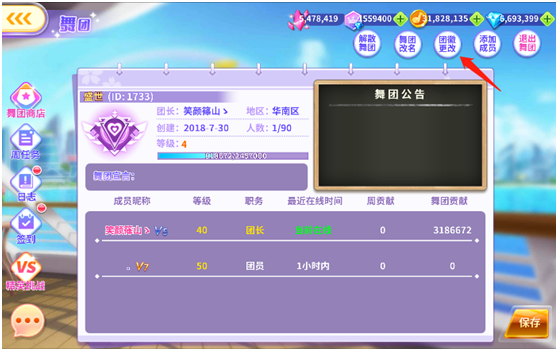 更新后团长可以在舞团管理页面点击【团徽更改】按钮,为舞团设置一个契合的舞团徽章。目前有4种团徽图样可供选择。