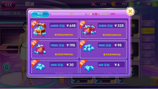 如果乐币或乐钻不足则会弹出充值界面,方便玩家进行充值