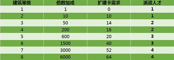在推主线的同时,还会获得扩建卡来升级建筑,由于这边是不氪金的,因此前7天获得的扩建卡数量有限,需要合理挑选店铺来升级。店铺升级的所需扩建卡和加成如下: