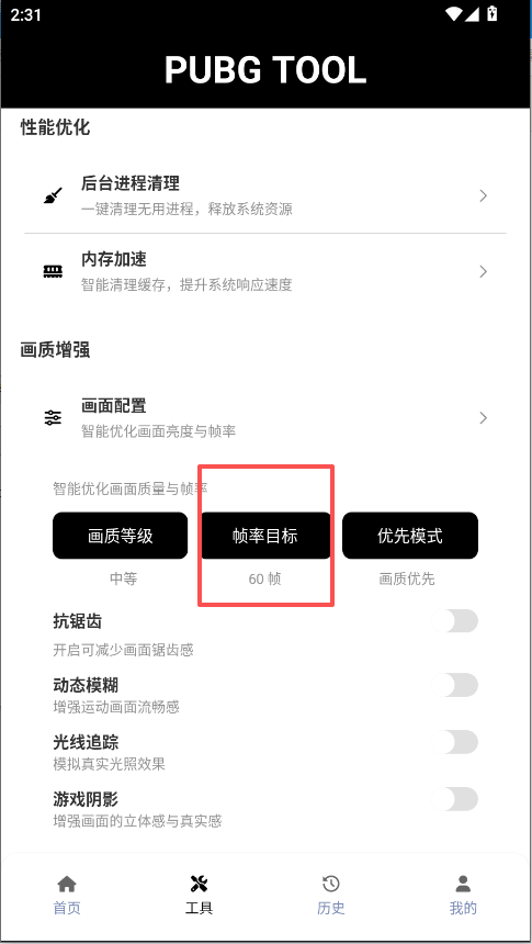 1、手机提前安装好和平精英游戏,下载安装本站提供的pubgtool画质助手,然后打开软件可以查看相关的说明;
