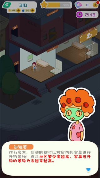 6、作为房东,您随时都可以对房内的家具进行升级置换,而且社区繁荣度越高,家具可升级的等级也会越来越高, 升级了家具,租客们会自觉提高租金的。没有人能从包租婆手下占到便宜,这里点击您想要进行操作的房间,就可以查看和升级家具