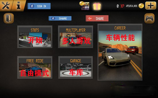 进入游戏后,会出现系统面板,分别代表了开始游戏、多人游戏、自由模式、车库、车辆性能等。