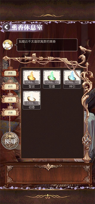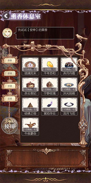 1、在熏香室,玩家通过正确使用熏香来招待顾客解锁相应剧情,并掉落调香材料。