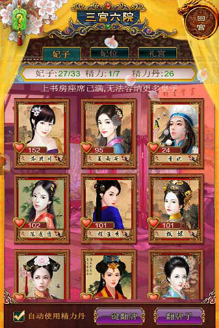 三宫六院:现在大清一共有33位妃子,但是初始妃嫔只有一位,其他妃嫔可通过跑马,寻宝等活动获得。