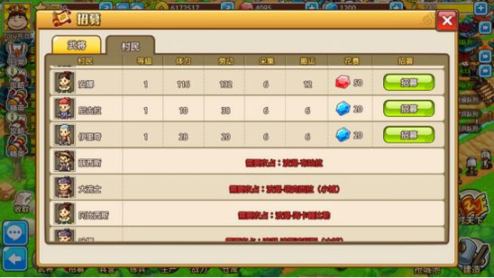 1、首先,村民需要通过村长大人们在主线关卡征战四方,击败相应关卡解锁相应村民后,才能在村庄左下角的【招募】→【村民】里进行招募。可以使用蓝钻或者红钻招募不同的村民。